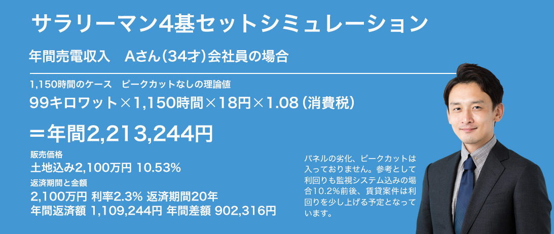アセットプラスがお届けする「土地付き太陽光発電」。「土地」「太陽光発電システム」「メンテナンス」がセットになっており、「土地も資金も知識も無い…」という初めての方でもリスクなく安定した収入を得られることで人気です。また20年という長期間に渡り固定価格で売電できるため、ビジネスマンの副業や定年後の年金補助など、近年注目の個人事業として始められる方が多くいらっしゃいます。