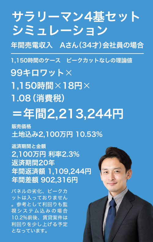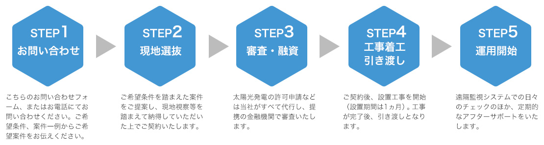 「土地付き・融資付き」プラン土地をお持ちでない方のために、土地+太陽光発電システム+メンテナンスをセットにしたプランをご用意。初めて太陽光発電事業を始められる方の多くは、このプランをお選びいただいています。また安定性が高いため融資が受けやすく、自己資金0円の方でも始められるよう融資付きプランもご提案いたします。